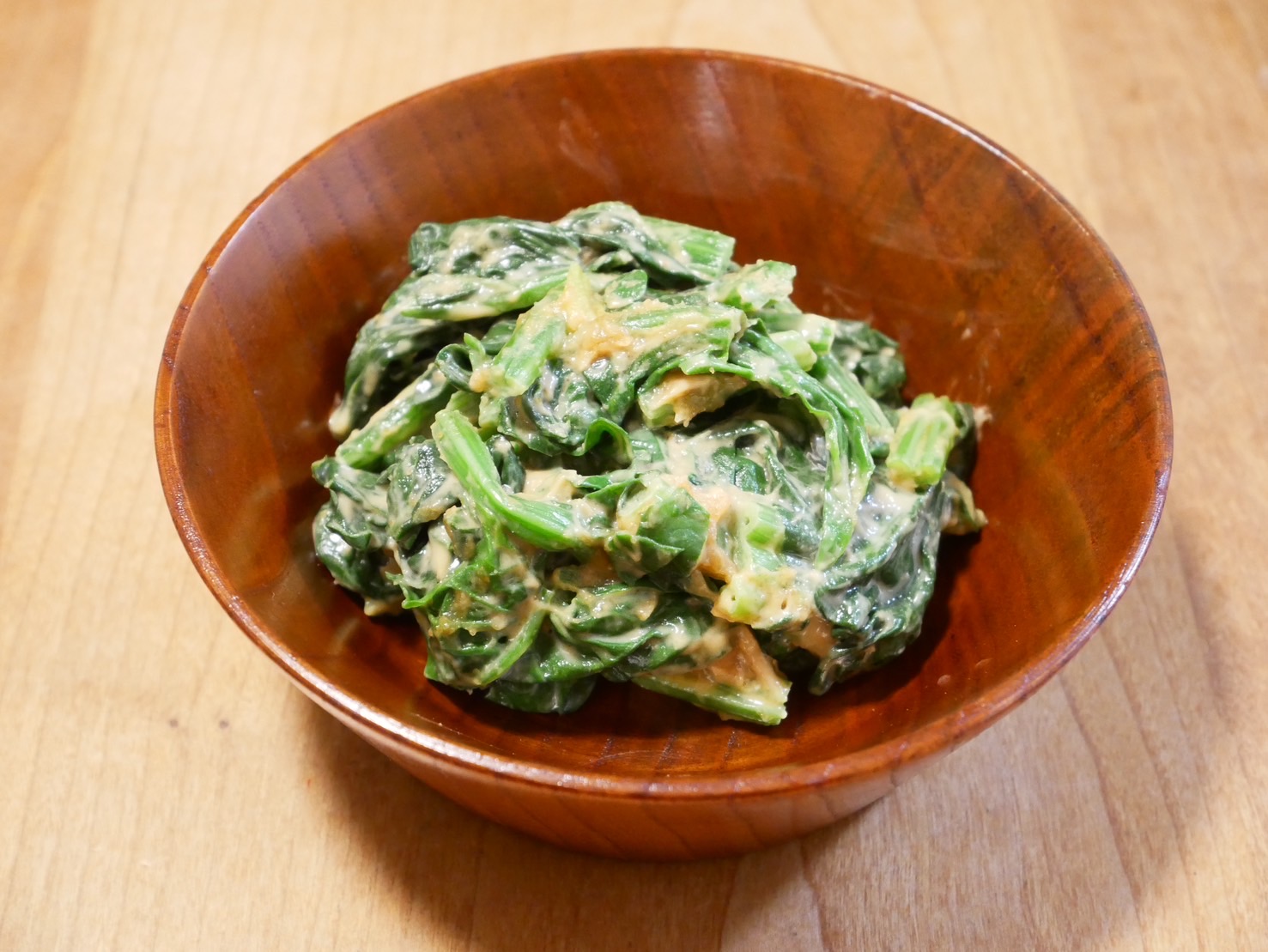 ①ほうれん草を塩湯でゆがいて食べやすい大きさに切る。