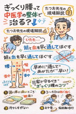 ぎっくり腰って、中医学の整体で治る?(たつお先生の現場解説)やっちゃったようです。ぎぐって!今朝、顔を洗おうと思った瞬間に「ズキッ!」と腰が固まって動けなくなりました。こんな時ってどうすればいいの?冷やすの?じっとしてるしかないの?まず結論...